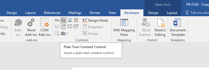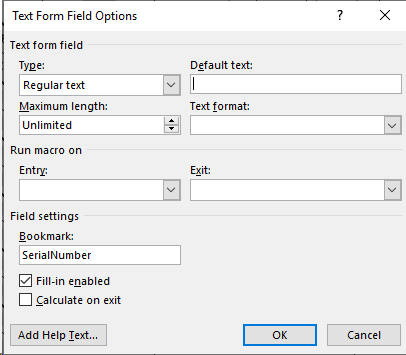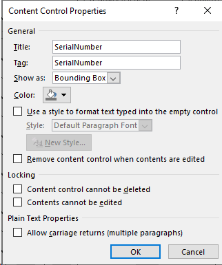 .DOCX and .DOCM formats may use either Legacy Forms Text Form Field or Plain Text Content Control under the Developer tab. Use SerialNumber for the Bookmark field for Legacy Forms and use SerialNumber in the Title field in the Plain Text Content Control properties.
